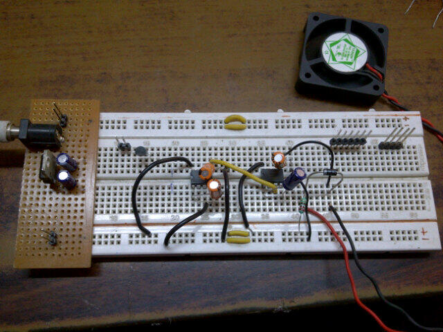 I made a laptop stand made out of a strip of mdf and two supports, it basically lifts the laptop a bit so as to give it some room the breathe, I have a small fan that runs on 24V, which I can use it on the stand to cool laptop a bit, also I didnt want to use a power adaptor or wall wart, I want to run it of the 5v from USB. After some searching, I came across many boost converter and stuff, but they were quite elaborate, I wanted something simple, few components and easy to make, I finally found boost converter IC, 7664, which would convert 5v to -5v, using just two capacitors, and this can be cascaded so by using two 7664 I could get -15V from 5V at its output, unforunately that IC was not available at the local electronics shop, but 7660 was available, the only difference was 7660 has max input voltage of 12v, and 7664 has 15 or 20V, any way the former IC will work just fine. I hooked up the circuit on a bread board and gave it a try, It worked, I got -15V at is output pin, so I connected the fan with 5V and -15v, but it didnt even budge, gave it a push it started to turn but at quite low speed, I could’nt even feel the wind because of the low current. So now I can find a fan that runs at 5v, or make a boost converter. But hey I found a easy way to get negative voltages, I think I should modify my bread board power supply with 7660 and get +5v, -5V and supply voltage.