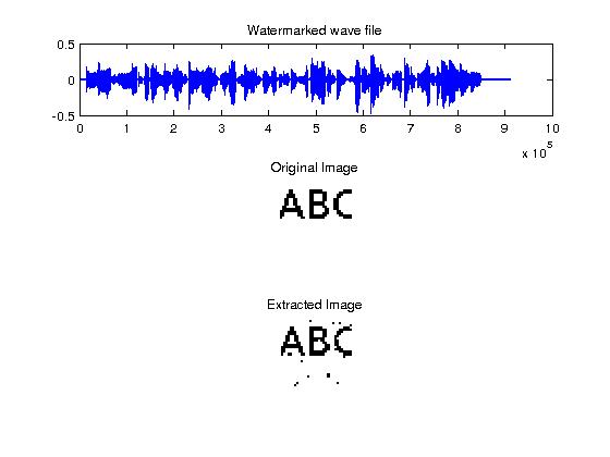 First the wav and bmp files are read, and stored in an array,then wavelet decomposition is done, the image array is embedded in the wavelet coefficients, then the output of the modified wav is plotted and after that the error between the original and watermarked is plotted, during the program execution both the files are played, and there is no audible difference between the two.