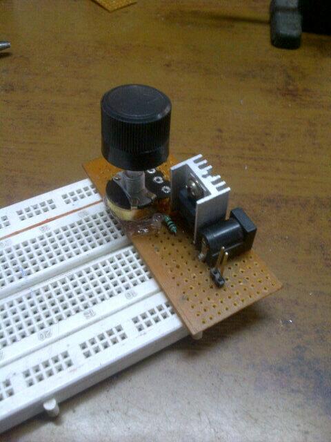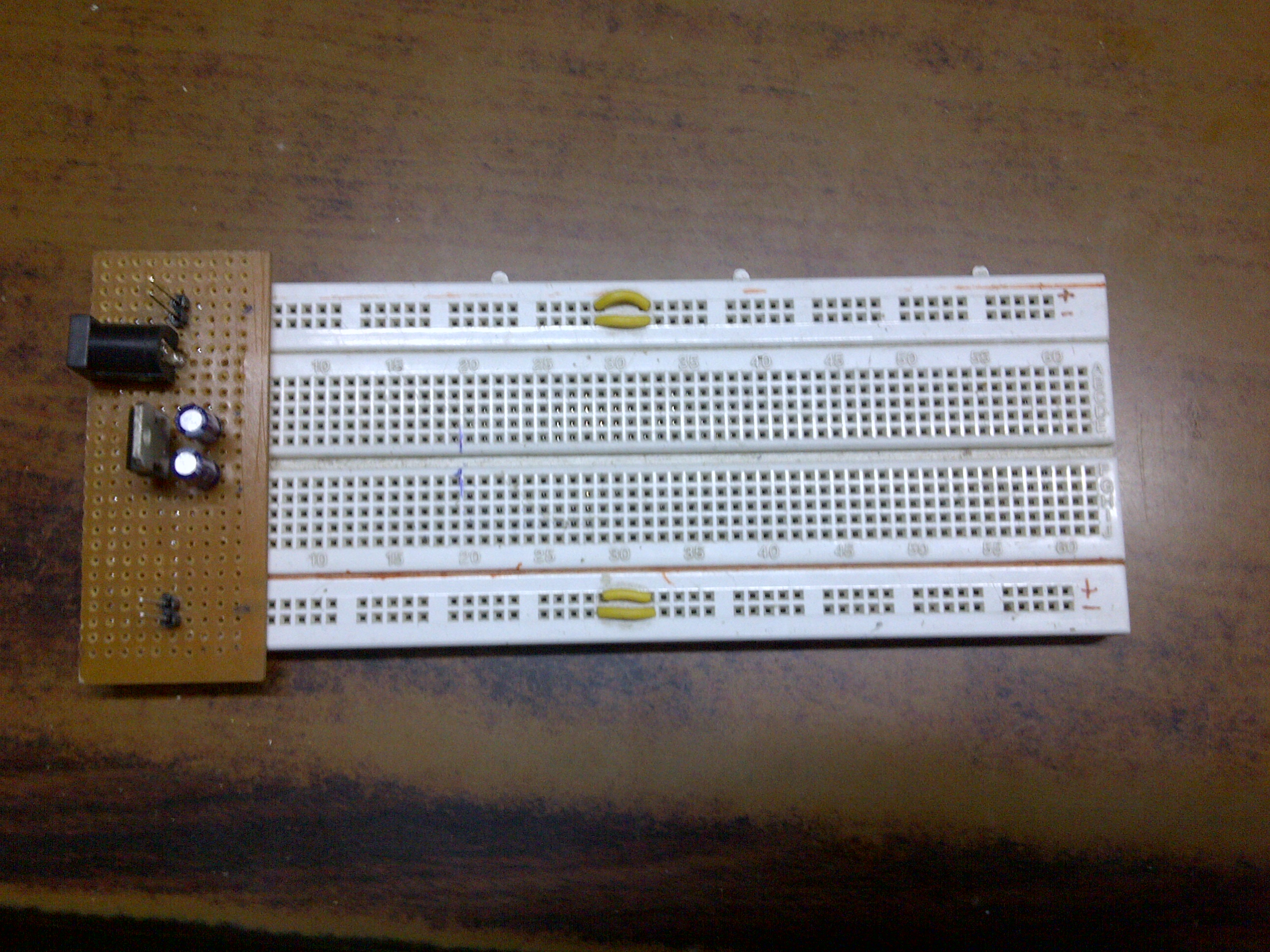 This is a nice little nifty circuit that has a power jack, 7805 regulator ,two capacitors and connector. It send the input power to upper rails and 5v to lower rails, really cleans up the mess of wires and its easy to debug the circuit that I’m working on.