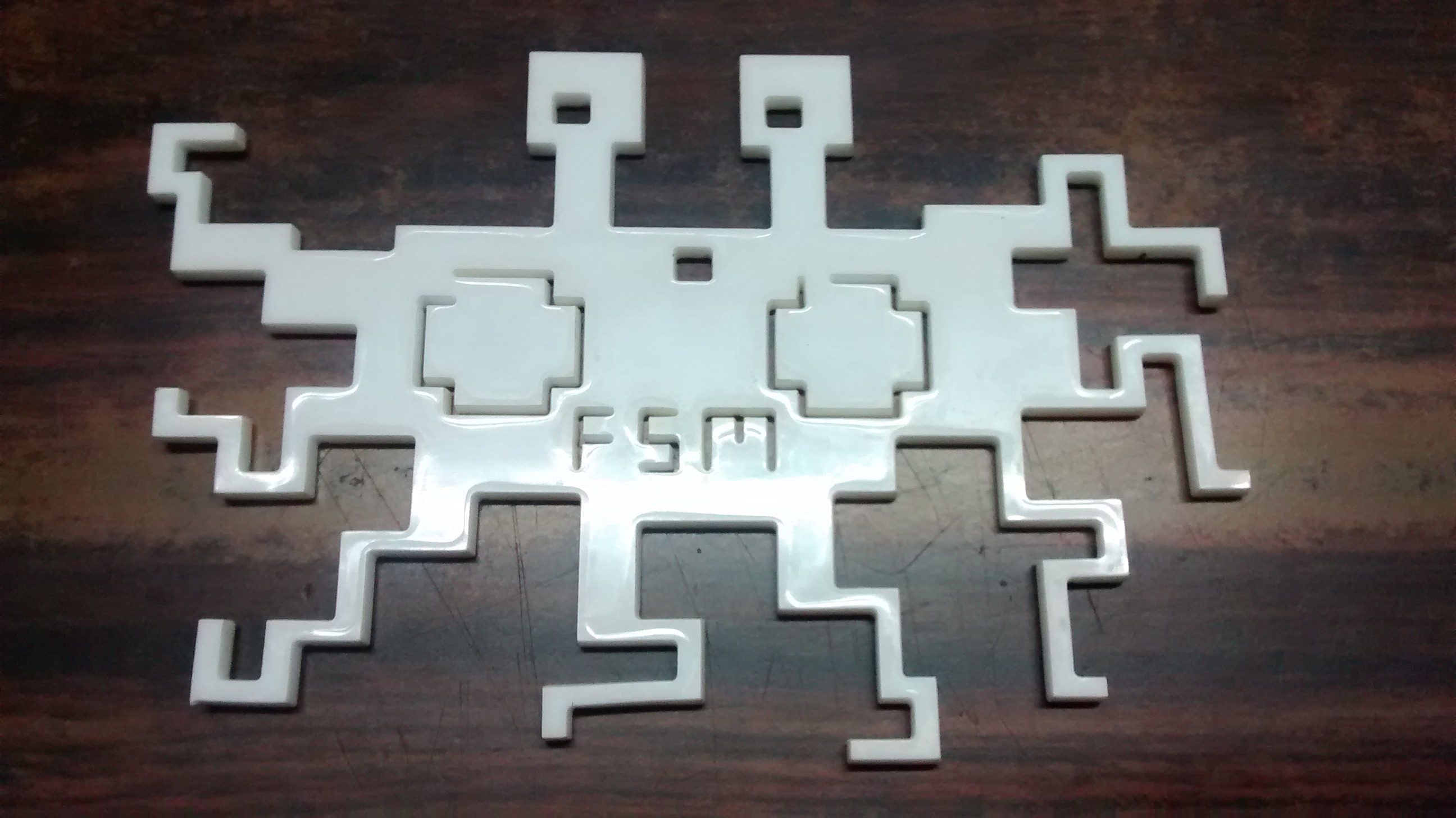 The FSM is hanging on the rear-view mirror of my car. The power setting was too high and the feed was slow, the edges on the part are a bit swollen.