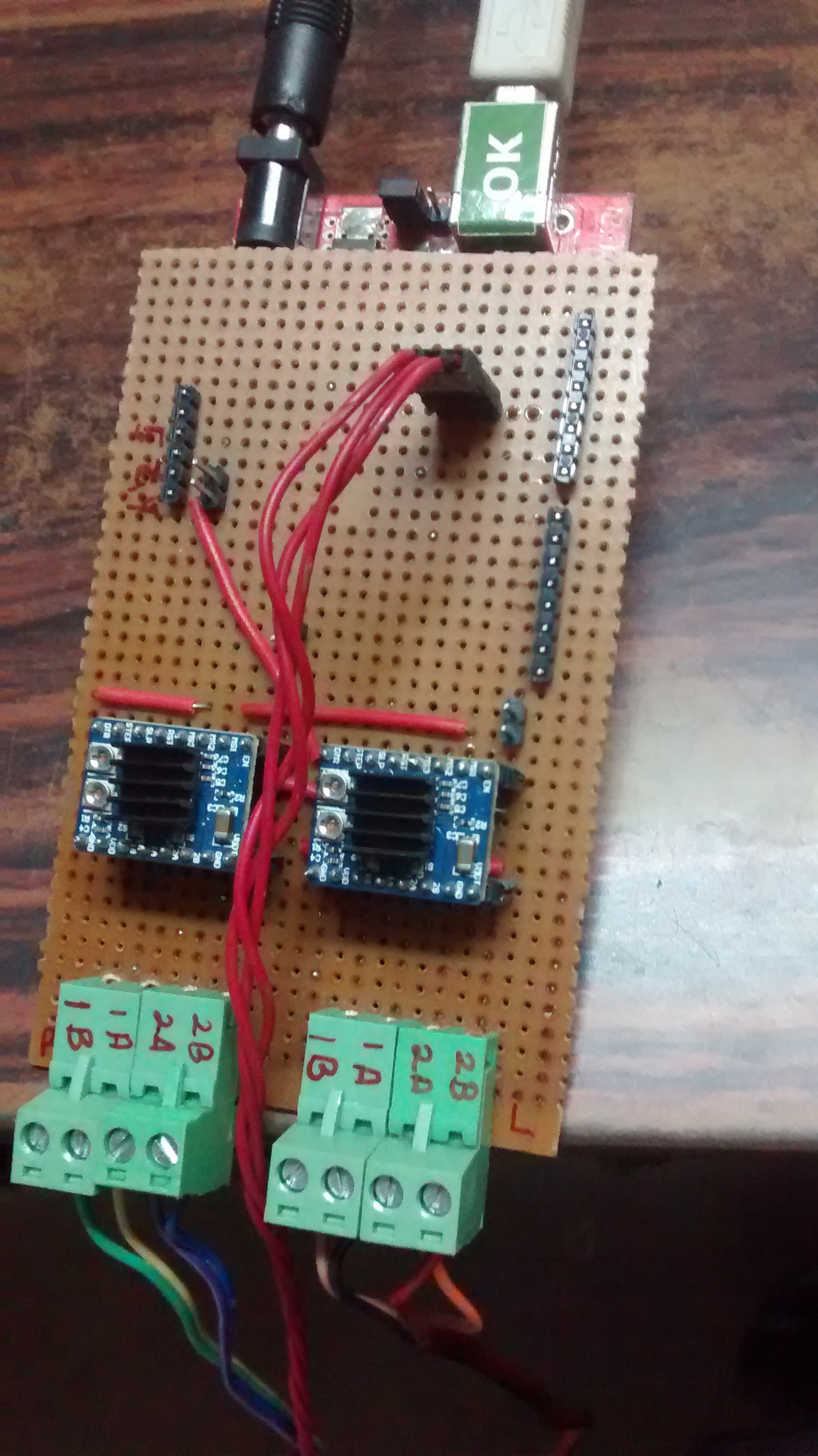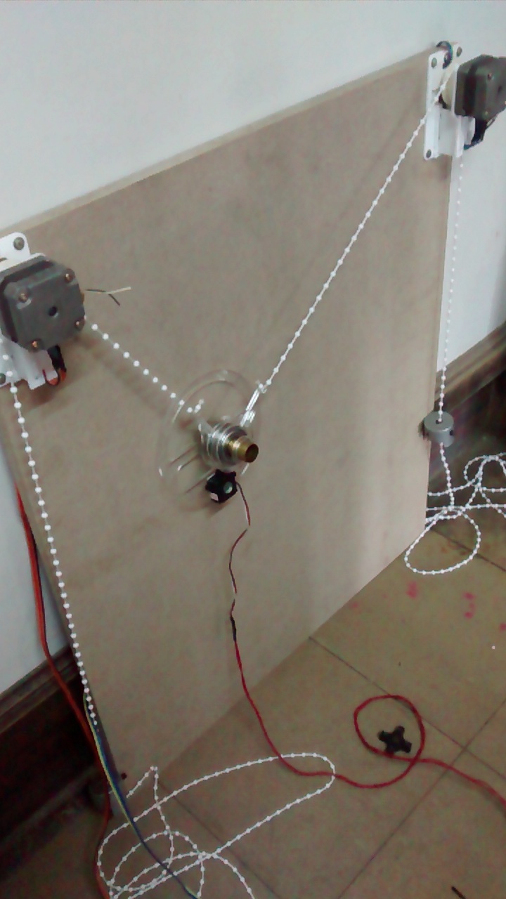 The drawing bot has two steppers motors on two corners and counterweights so a motor with less torque can be used. There are many firmwares that can do this. The polargraph was byfar the most compelet project with really nice documentation and nice community of users. The gondola carries the pen/marker and a servo that lifts it up whenever necessary.