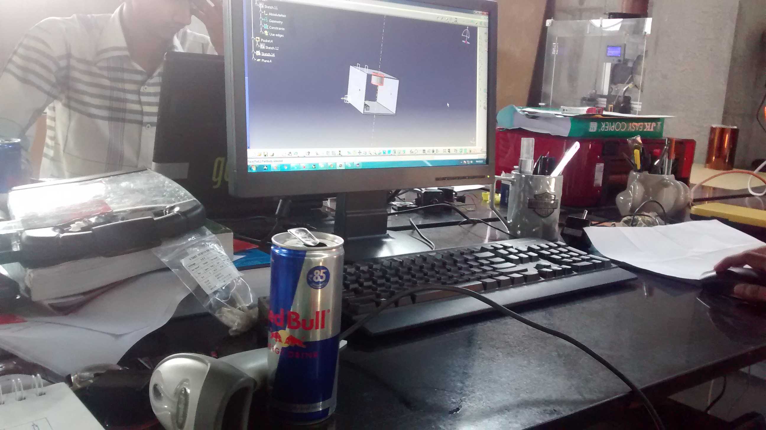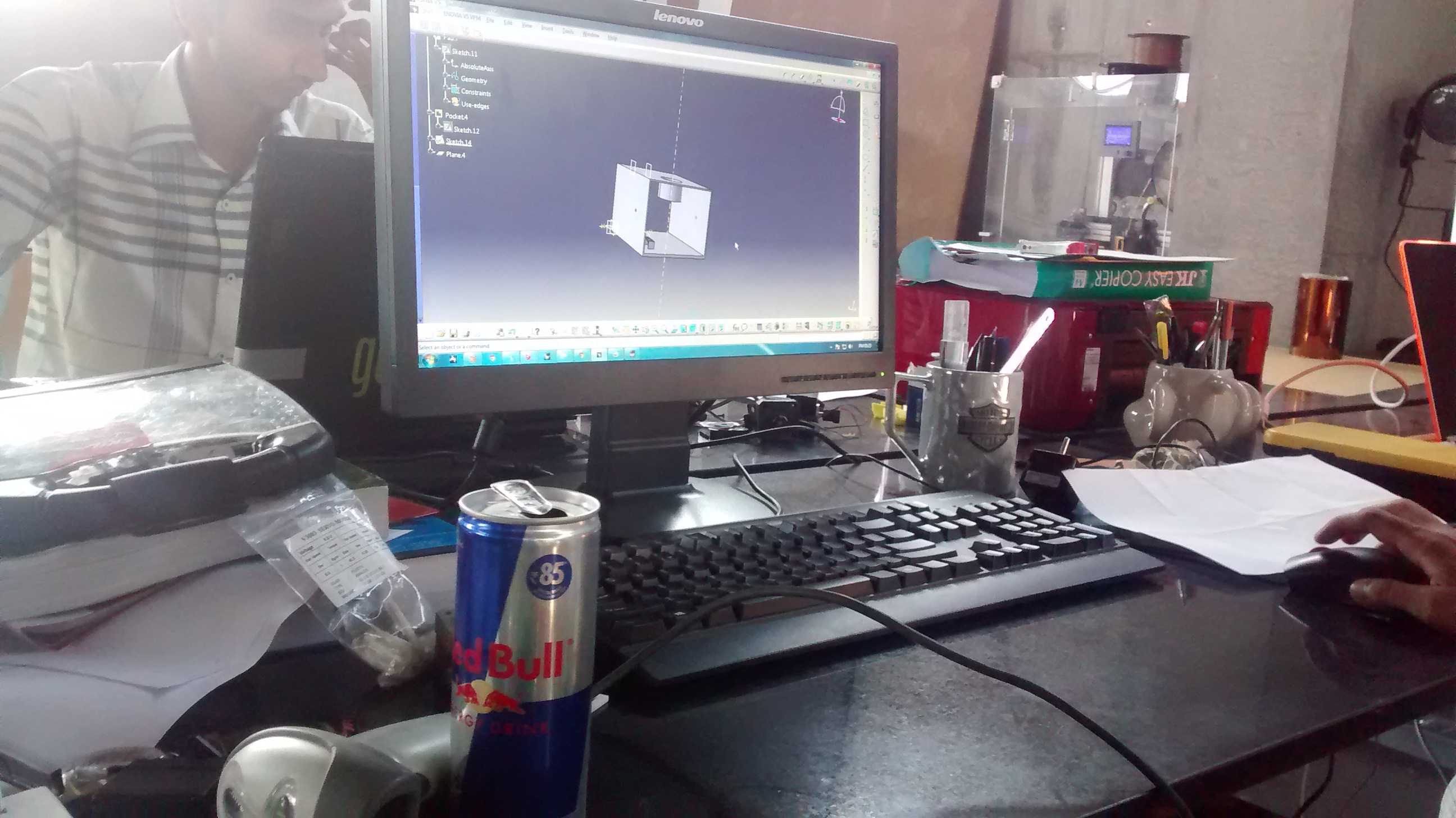 The cogs and gears started to tick, on how to detect if its red bull, and yes there are 6 variants of red bull, the standard one, a bigger can, red edition, blue edition, silver edition and sugar free red bull. After a lot of debating on the best and robust way of detecting the can, reading the bar-code of the can was the best option. So the user would insert the can, which cannot be taken out, the bar-code would be scanned, get thrown in the storage bin in the machine and the controls would become active and user would get few minutes to play. A button is also provided for the user to renew the timer so the game can be played for a longer time. I did the electronics part and also conceptualize the mechanism that would scan and read the bar-code. The CAD modelling was done by Anand Tandel at Element-8 and also the parts were printed on their prusa. Siddhant, the owner of Element-8 design was kind enough to let me use his expensive tools and workshop space.