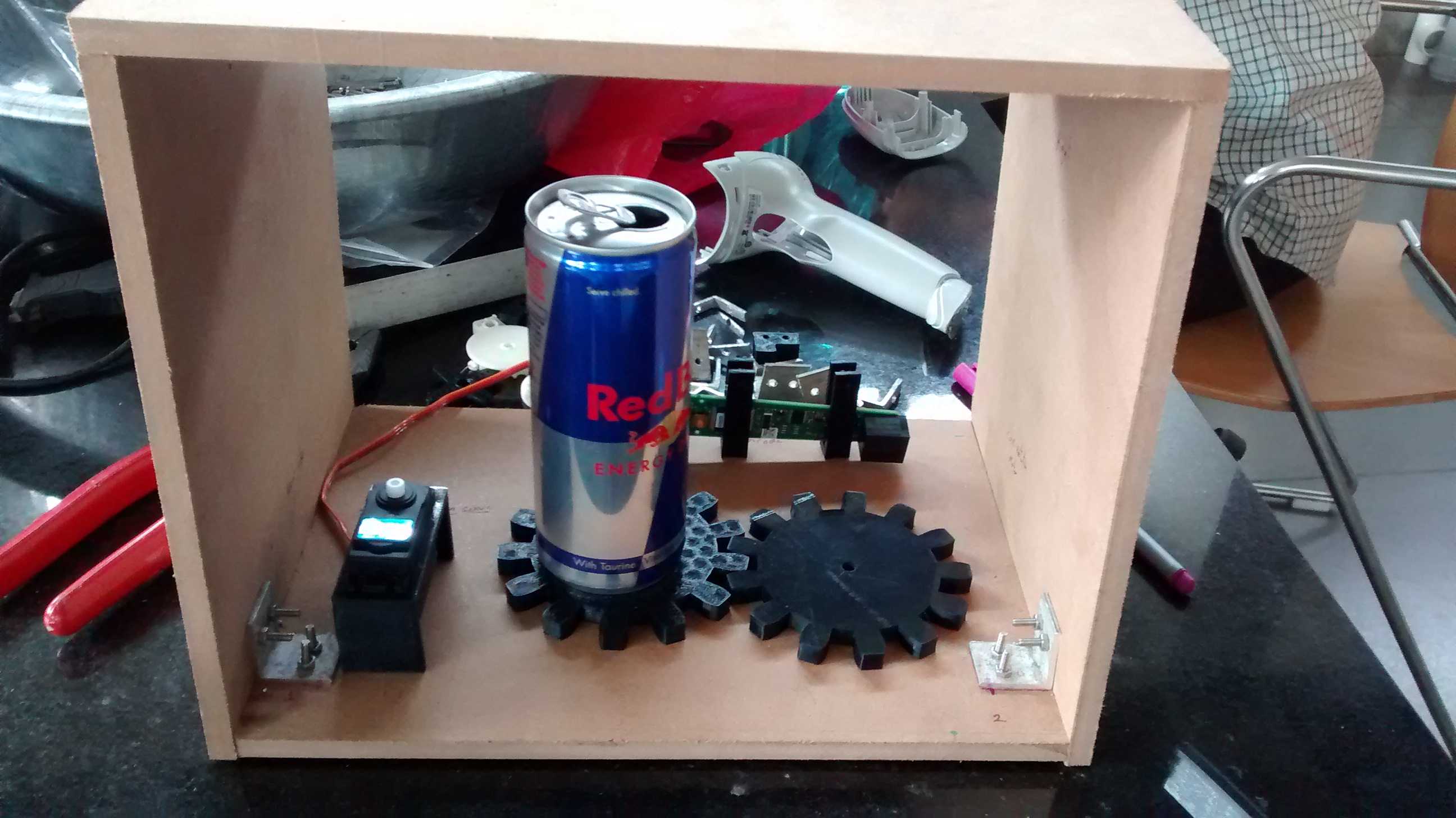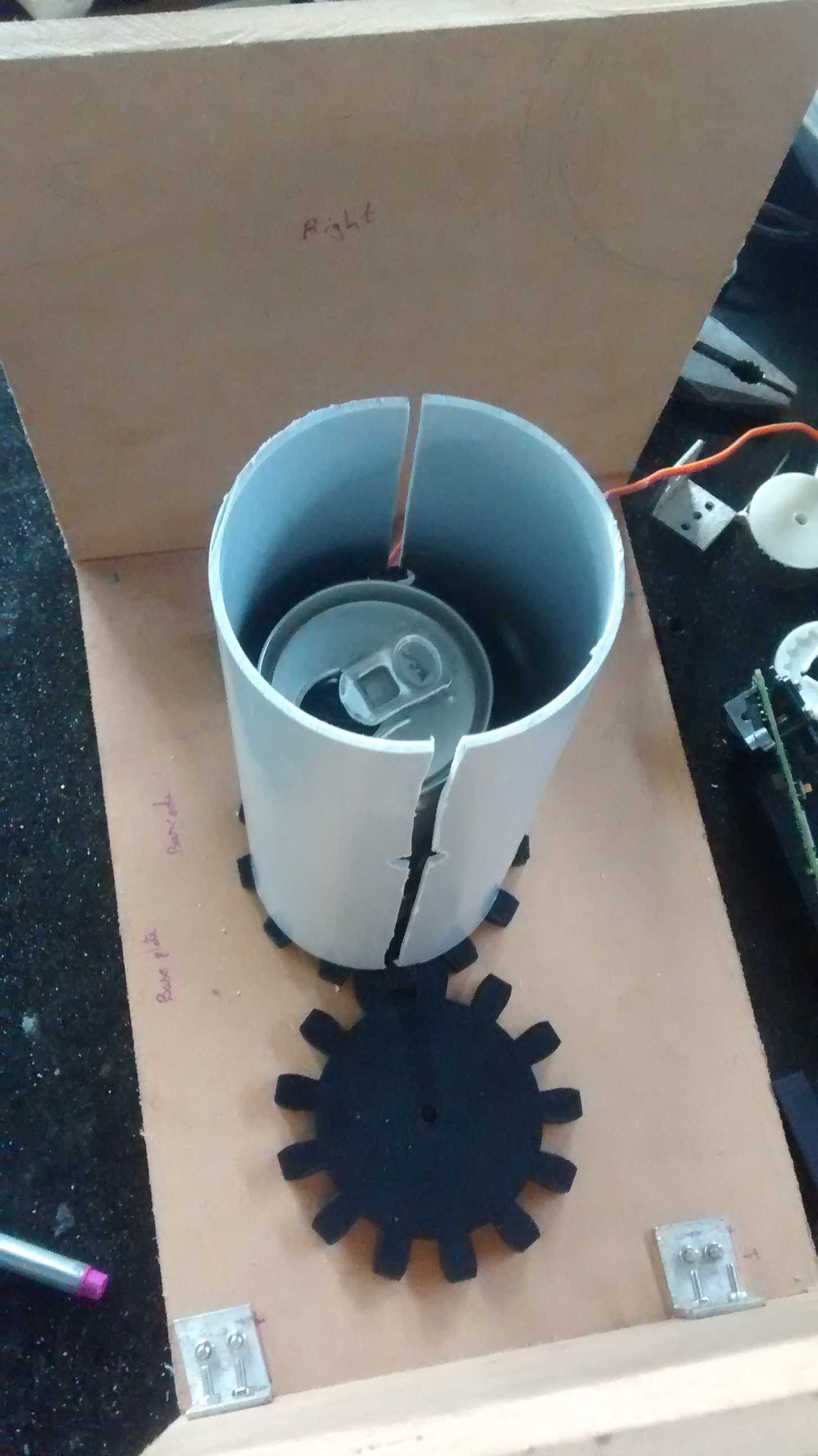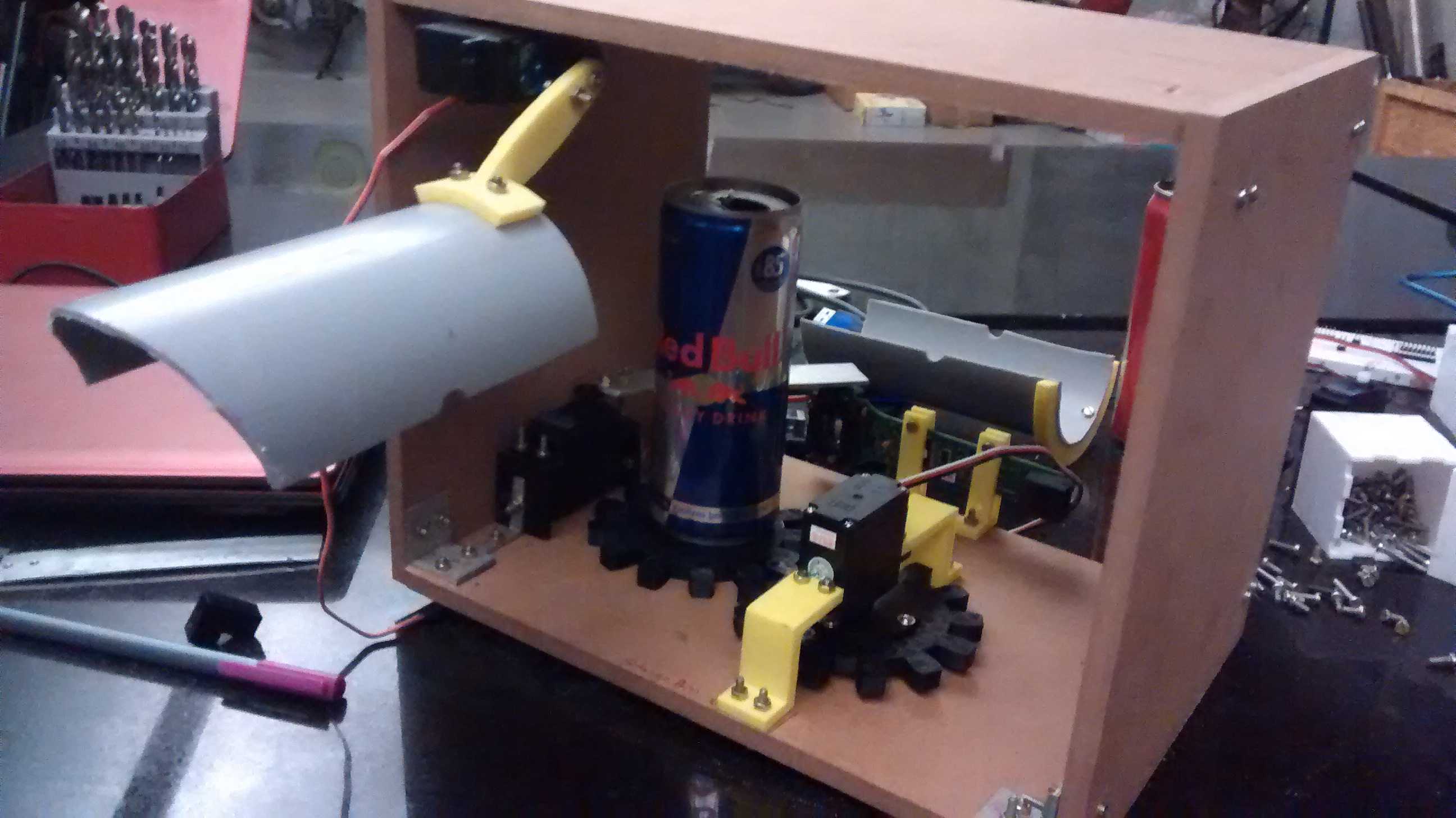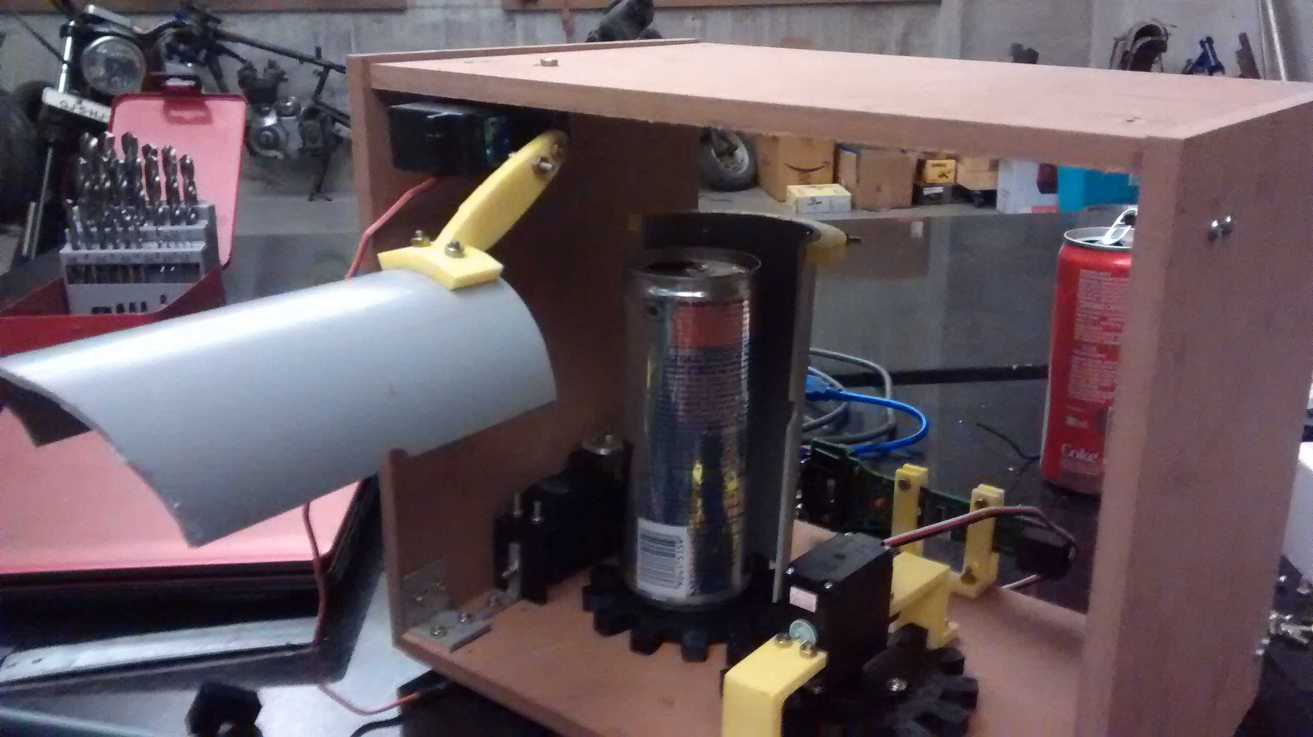 The internal mechanism works like this, the can is dropped in the scanner, distance sensor detects the can, a continuous servo rotates the can via 1:1 gear and the bar-code scanner is turned on, as soon as the bar code is read, half pipe is raised and an arm sweep the can off into the bin, controls become active and all is homed in the scanner.
