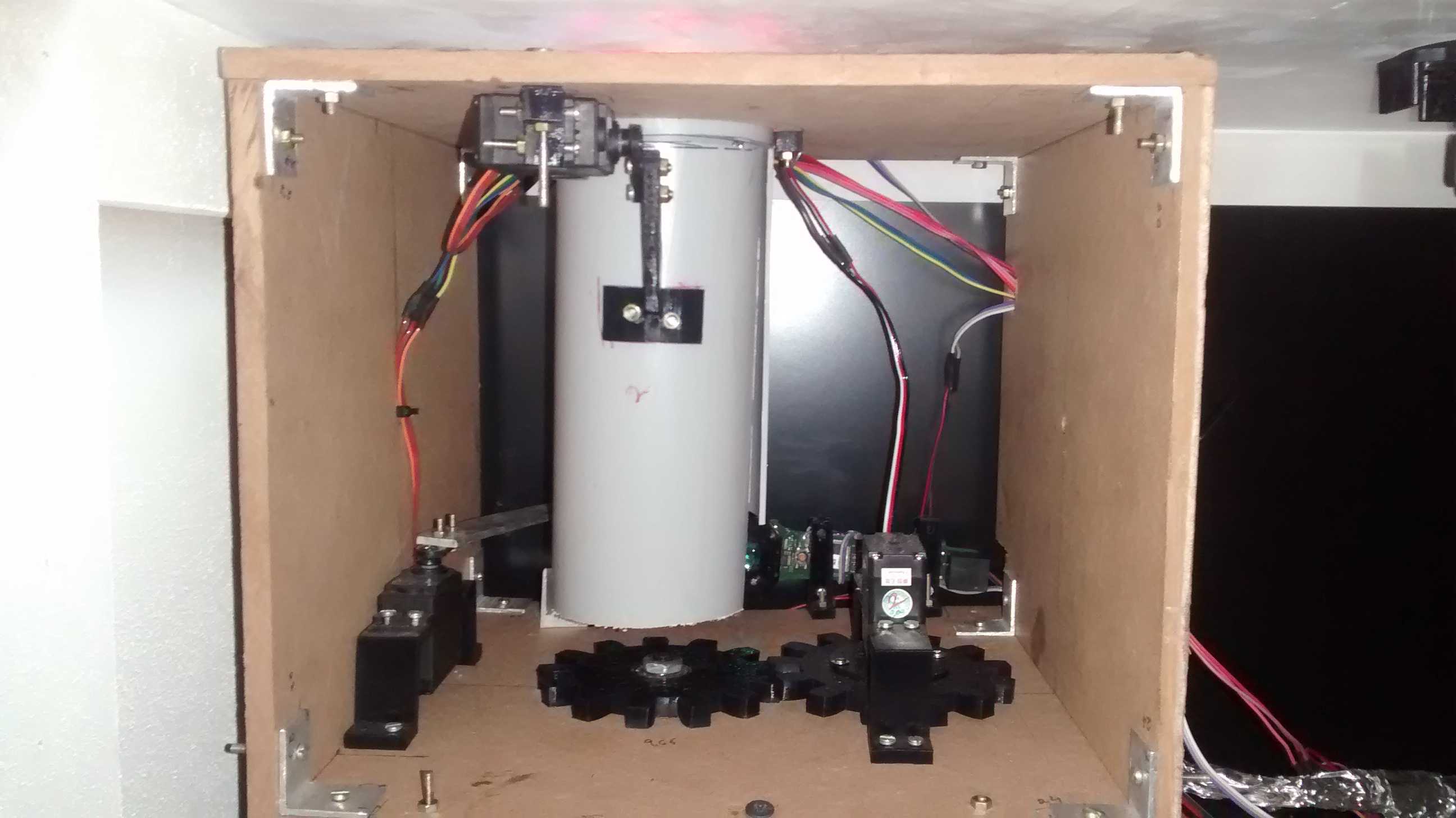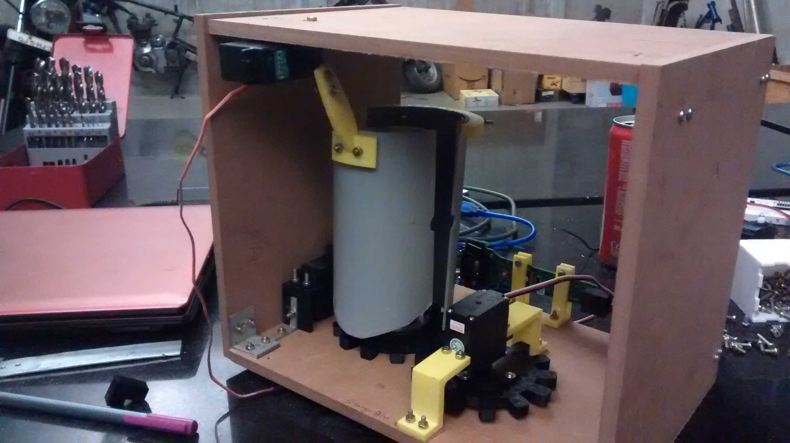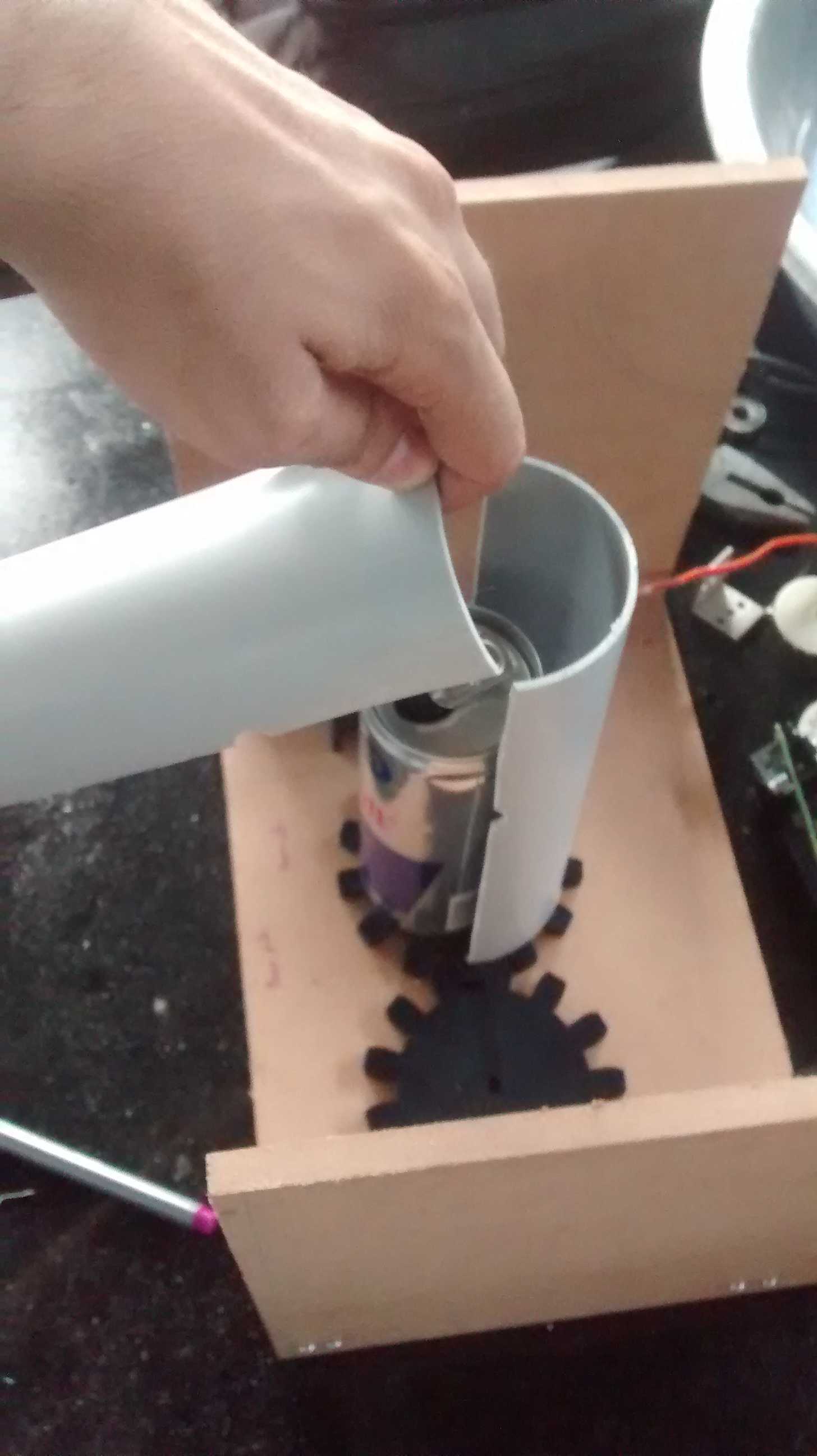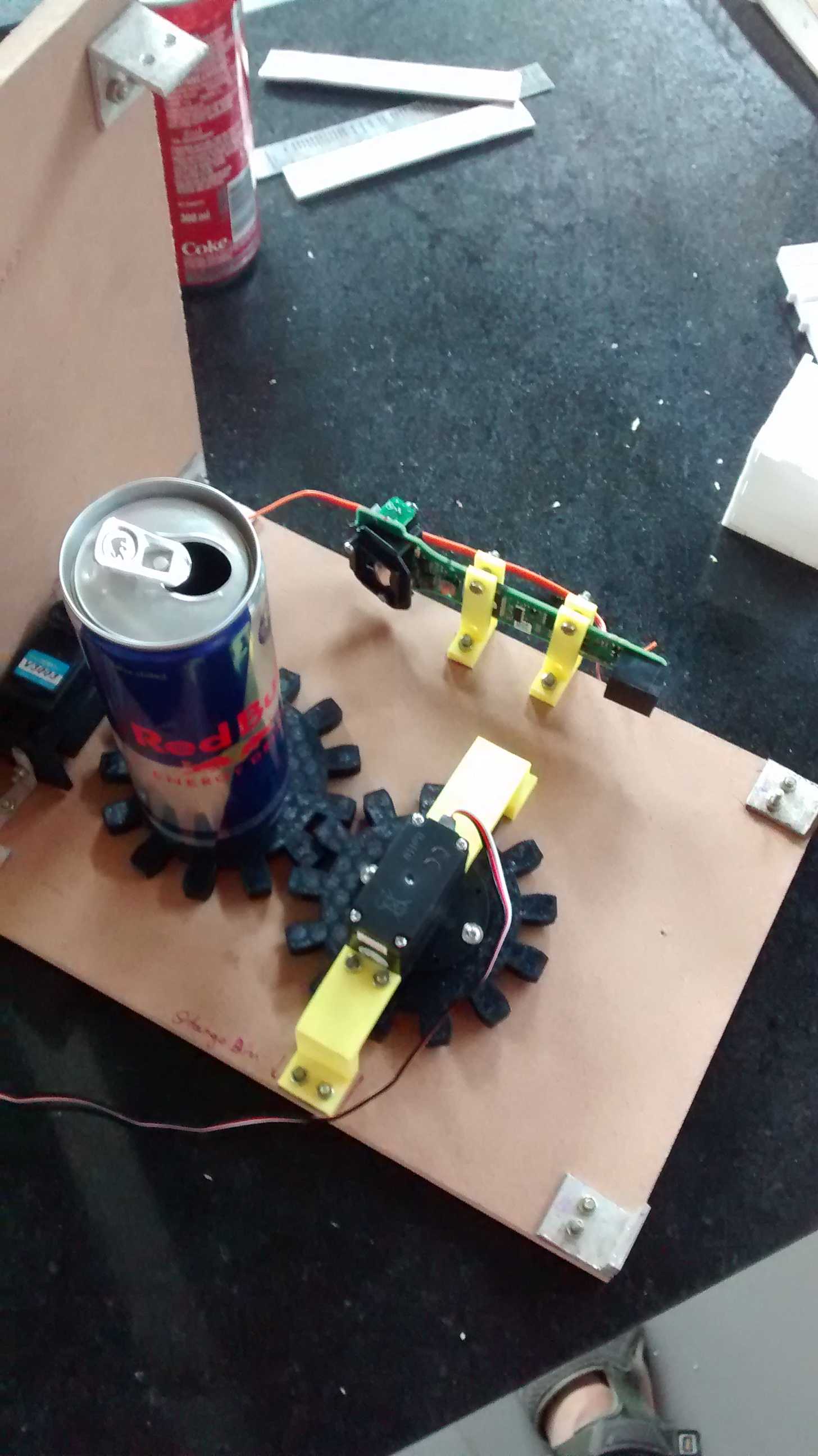 The internal mechanism works like this, the can is dropped in the scanner, distance sensor detects the can, a continuous servo rotates the can via 1:1 gear and the bar-code scanner is turned on, as soon as the bar code is read, half pipe is raised and an arm sweep the can off into the bin, controls become active and all is homed in the scanner.