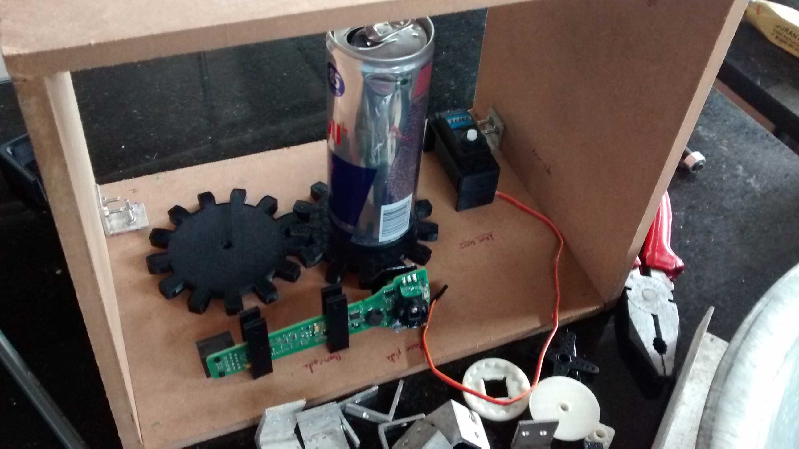 Update #4 Printed the one gear as a sample, it came out in oval shape, so made some adjustments,and printed it again, it came out all good. I made a last minute design change and those parts started print in evening, it was a 5 hour print, we kept the printer running and closed the workshop. It should be done by now. I tested out the can rotation mechanism manually. On electronics side finally stated to make some progress. I tested one button press via connecting the wires. Also I tested simulated button press via electronic signals using 4066. It did not gave expected results, I’ll be testing with other ICs. The xbox 360