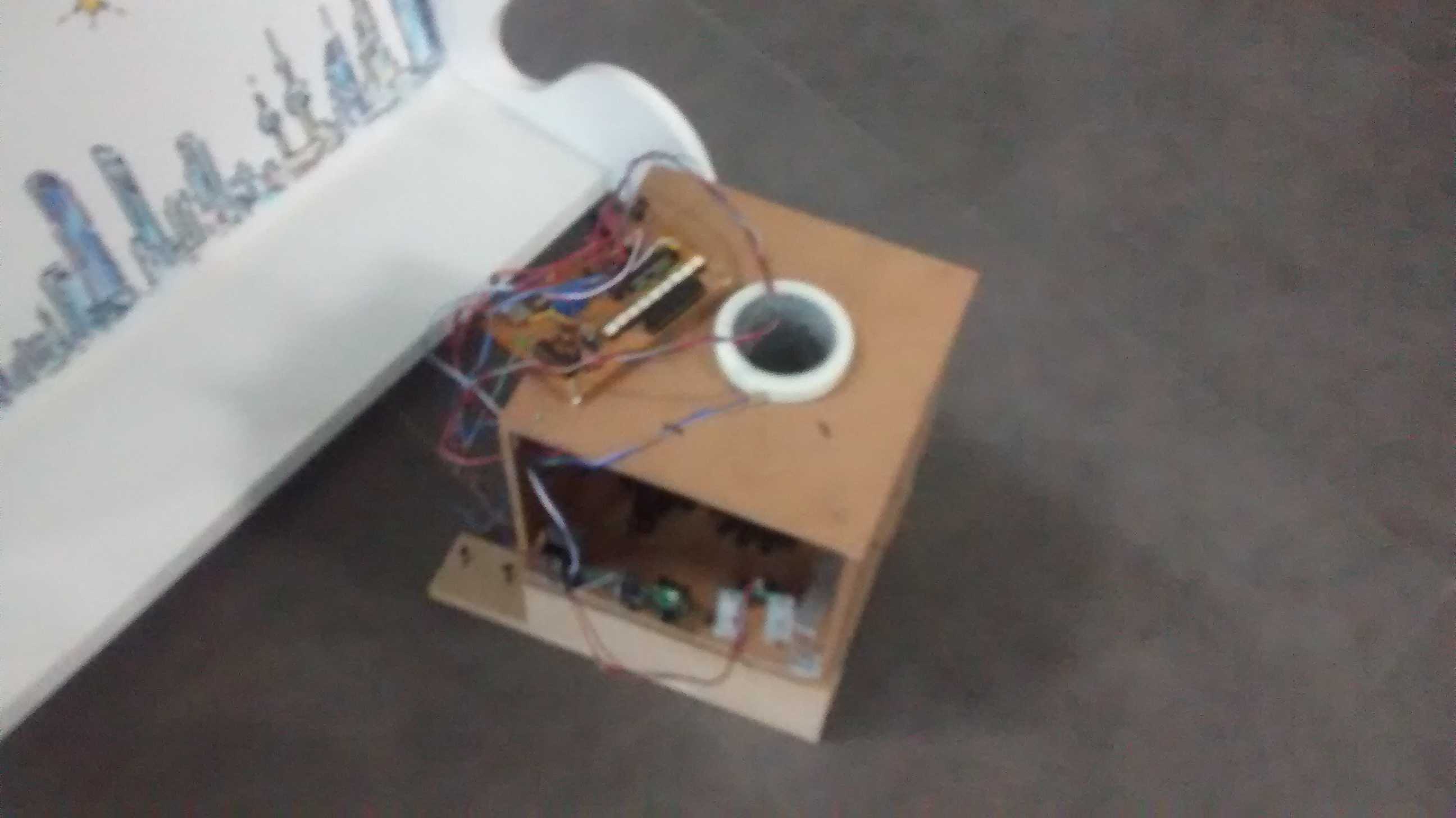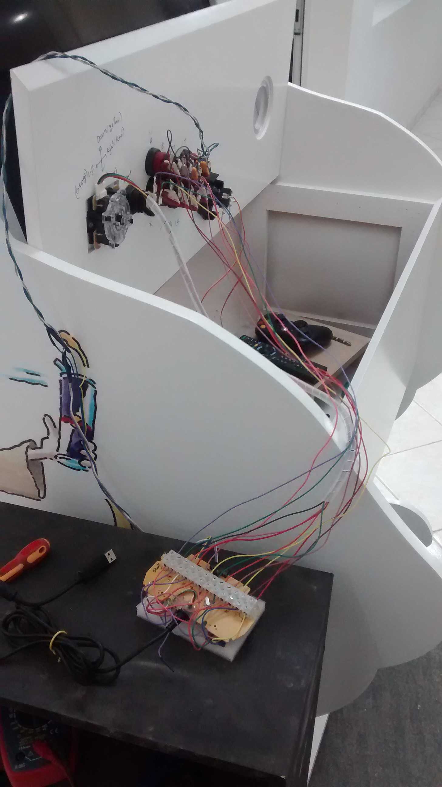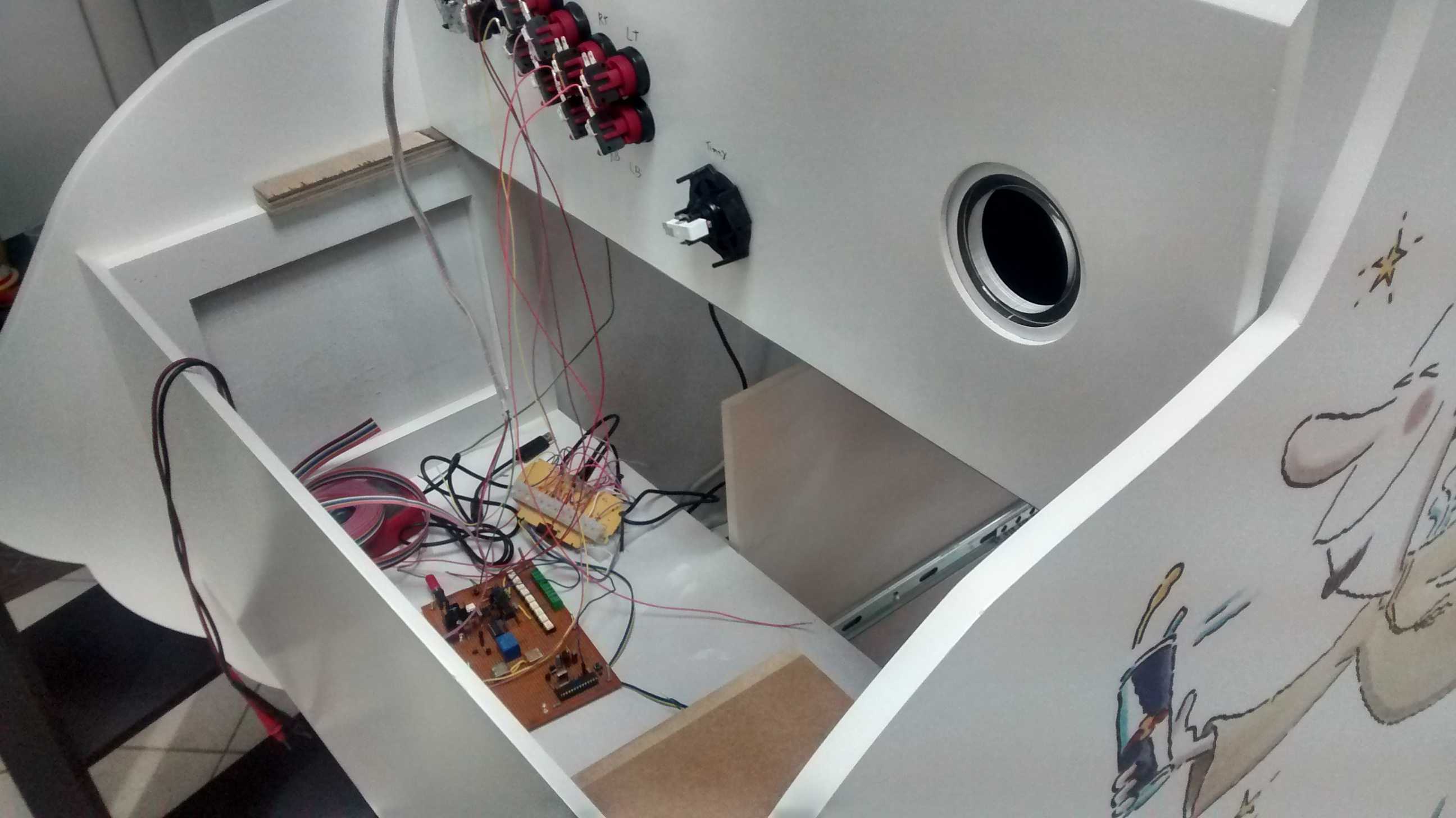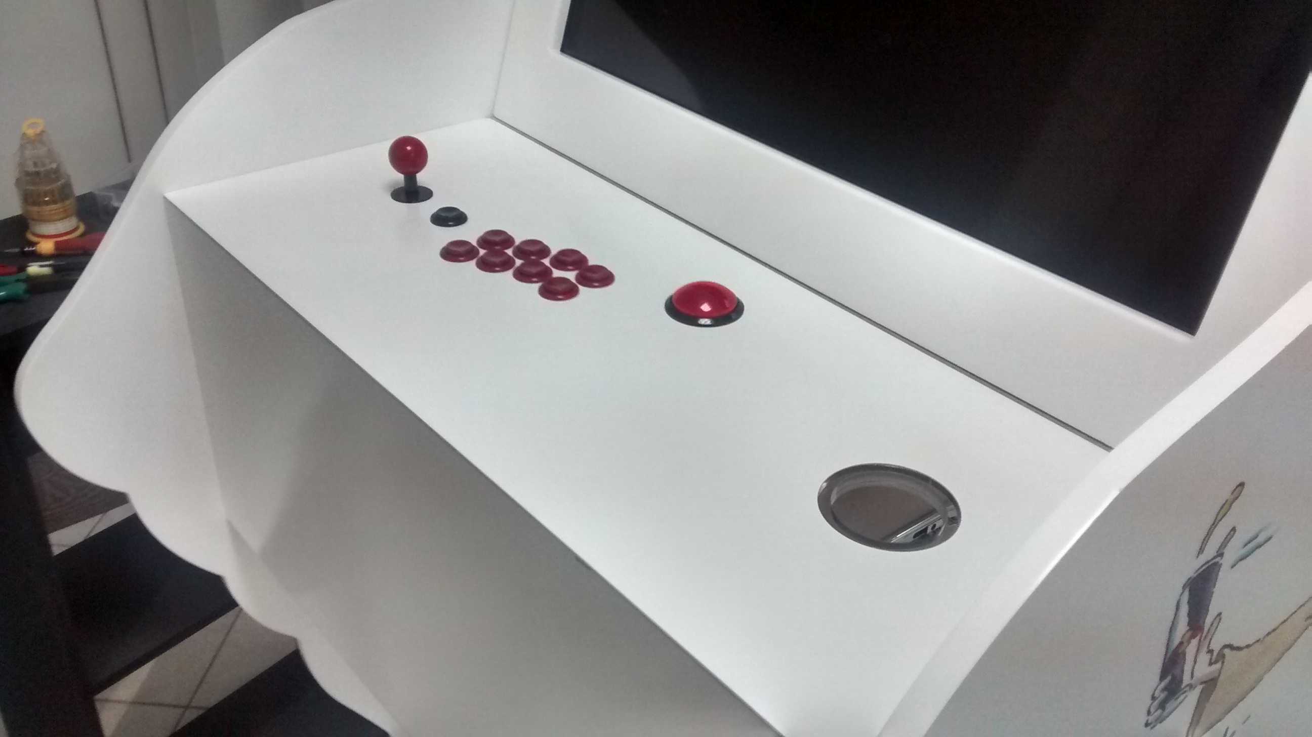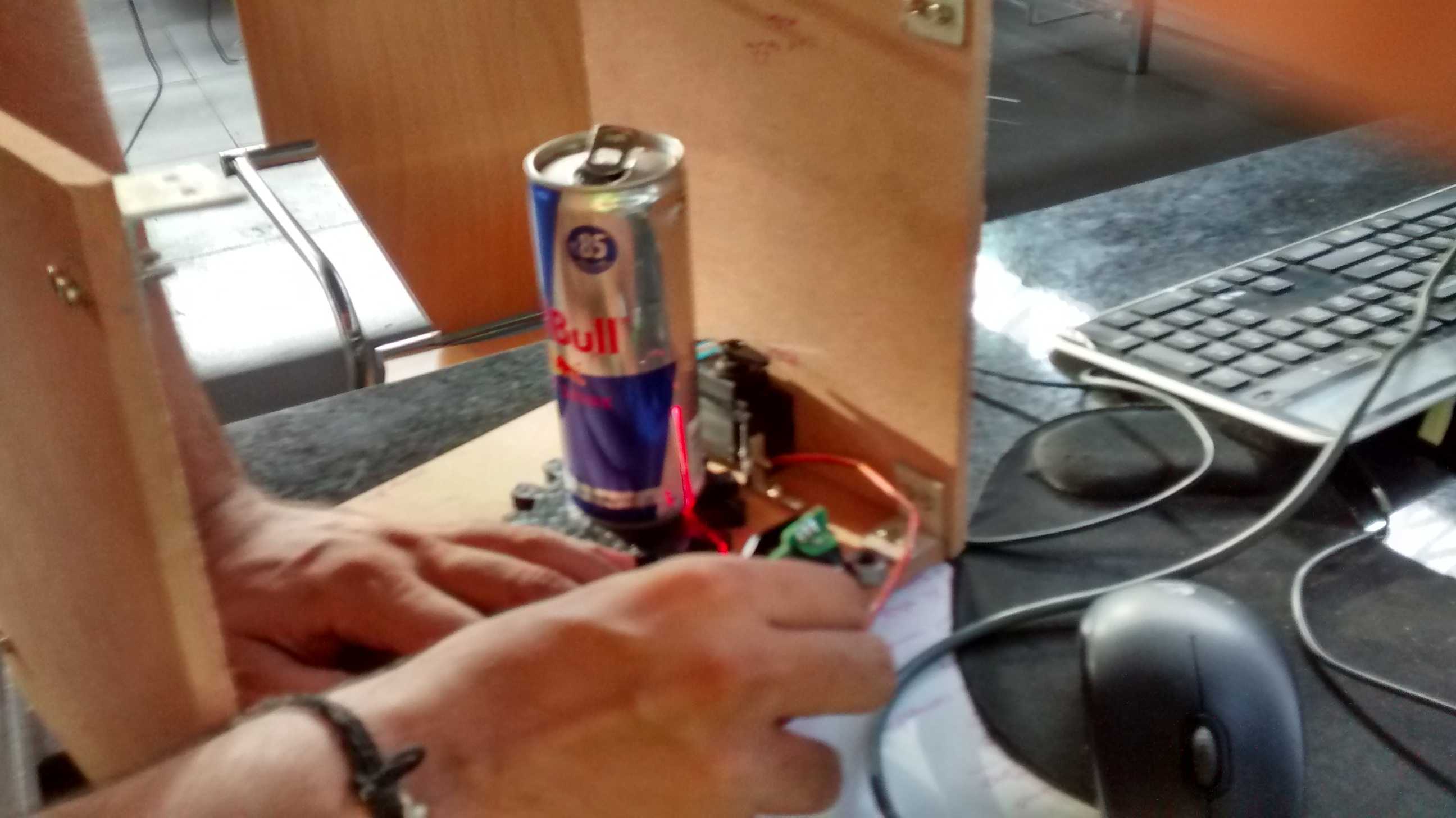 So the machine works like this, user inserts an empty can in a hole,the scanner inside the machine check if its a red bull can it activate the controls, joysticks and buttons for 4 minutes, a reset button resets the timer back to 4 minutes so user can play for longer timer if he/she wishes.